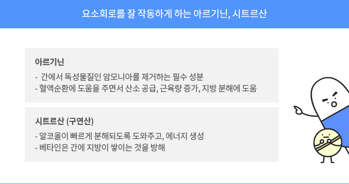 간 보호 제품의 주요 성분은 요소회로를 잘 작동하게 하는 아르기닌, 시트르산 등입니다.