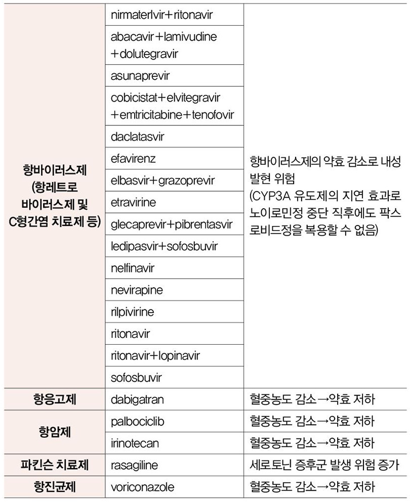 또한 세인트존스워트는 대표적인 CYP-450 대사 효소 유도제로 다양한 약물과 상호작용이 있는데, 그중 식약처에서 지정한 병용 금기 항목은 다음과 같다. 특히 코로나19 감염증 치료제인 팍스로비드정도 포함돼 있어 주의가 필요하겠다.