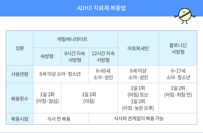 메틸페니데이트는 뇌에서 도파민과 노르에피네프린을 증가시키며, 아토목세틴은 노르에피네프린을 선택적으로 증가시킵니다. 클로니딘은 기본적으로 고혈압 치료제로 알려져 있지만 약물이 서서히 방출되는 서방형의 경우 ADHD 치료에 사용할 수 있도록 승인을 받았습니다. 뇌에서 감정이나 주의력, 행동을 관찰하는 영역에 작용해 ADHD 증상을 감소시키는 것으로 추정합니다. ADHD약은 성분과 제형에 따라 사용 연령, 용법에도 조금씩 차이가 있습니다[위 표 참조]. 약물치료와 함께 비약물요법을 병행하면 더 큰 치료 효과를 기대할 수 있습니다. 비약물요법으로는 행동 수정과 사회성 훈련, 인지·행동요법 등이 활용됩니다.