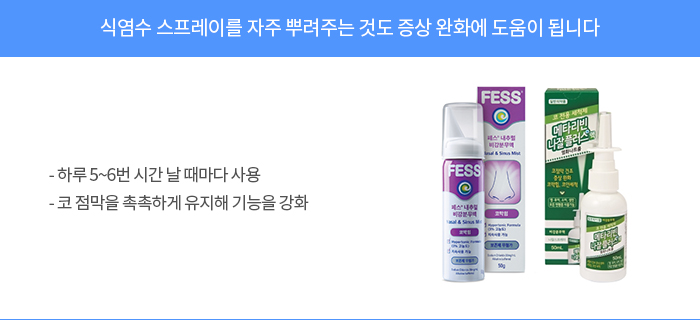 이밖에 약은 아니지만 비염 치료에 도움이 되는 보조제도 있습니다. 바로 식염수입니다. 아침 저녁 하루 두 번 식염수를 한 쪽 코에 넣어 다른 코를 통해 나오게 하는 비강 세척 요법으로 코 점막을 씻어주면 염증 물질이 씻겨나가고, 점막 세포 기능을 원활하게 해 항원·항체 반응도 줄일 수 있습니다. 세척을 꾸준히 하다보면 비염 증상이 줄어들 수 있습니다. 식염수 세척이 번거롭다면 식염수 스프레이를 사용하는 것도 좋습니다. 최근에는 방부제가 없는 식염수 스프레이도 많이 나오고 있습니다. 하루 5~6번 시간 날 때마다 뿌려주면 코 점막을 촉촉하게 유지해 점막 기능을 강화할 수 있습니다.