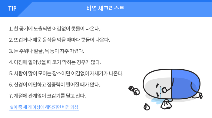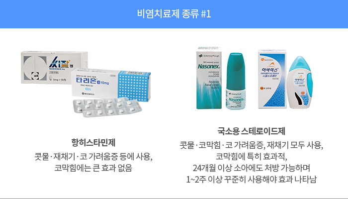 이런 비염은 원인은 다르지만 증상은 모두 같습니다. 앞에서 말한 대로 콧물·코막힘·재채기가 나타납니다. 그래서 사용하는 치료제도 같습니다. 원인을 치료하는 면역요법이 있긴 하지만 길게는 3년 동안 주 1회 주사를 맞거나 매일 약을 복용해야 하기 때문에 번거롭습니다. 유아의 경우 약물을 최대한 쓰지 않으려는 부모의 손에 이끌려 면역치료를 받으러 다니는 경우가 있긴 합니다. 하지만 성인들은 대부분 면역치료를 유지하지 못합니다.