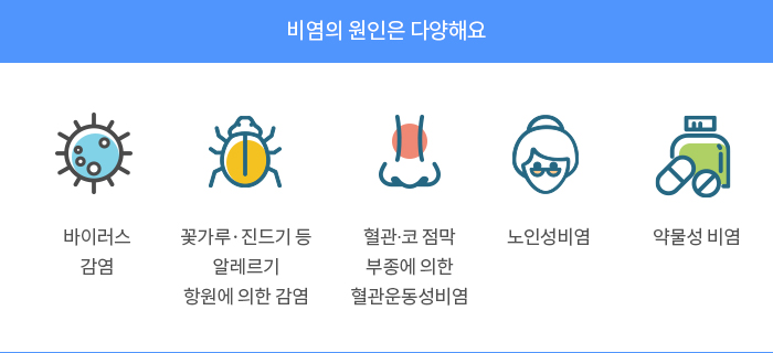 이 비염은 원인이 여러 가지입니다. 겨울철에 흔한 것은 바이러스에 의한 감염입니다. 바이러스가 침입하면 코 점막이 부풀고, 점액이 분비됩니다. 알레르기 항원에 의한 감염도 있습니다. 꽃가루, 집먼지, 진드기, 곰팡이, 애완동물의 털 또는 비듬, 바퀴벌레 부스러기 등에 의해 생깁니다. 혈관운동성비염도 있습니다. 술이나 맵고 짠 음식, 향수나 담배연기, 급격한 온도 변화로 혈관과 코 점막이 부풀고, 이로인해 코막힘이나 콧물 등이 생기는 비염을 말합니다. 이 밖에도 코의 점액세포 노화로 기능이 떨어져 생기는 노인성비염, 약물 복용으로 인한 약물성 비염 등이 있습니다.