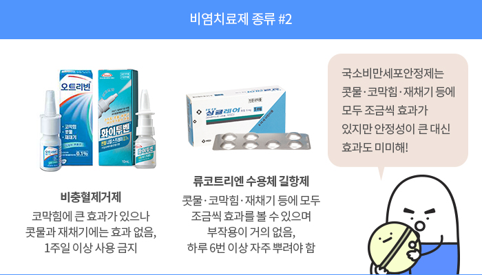 그래서 대부분의 성인들은 콧물·코막힘·재채기 증상을 완화하는 대증(對症)치료제를 선택합니다. 콧물·코막힘·재채기에 효과적인 약물은 크게 3가지로 나눕니다.
