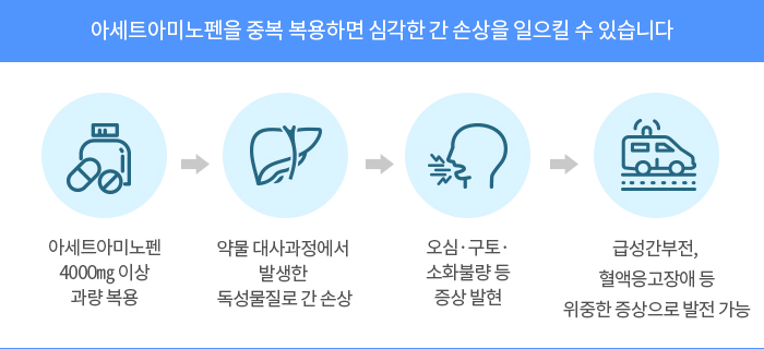 아세트아미노펜은 몸 속에 들어가면 간에서 대사돼 몸 밖으로 배출됩니다. 과량 복용하면 간에서 약물이 대사하는 과정에서 독성물질이 많이 생성돼 심각한 간 손상을 일으킬 수 있습니다. 만일 간 독성이 생기면 오심·구토·소화불량·피로감 등이 나타납니다. 복용 후 72시간이 지나면 급성간부전, 혈액응고장애, 신부전 등의 위중한 증상으로 이어질 수도 있습니다.