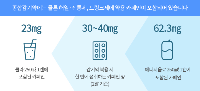 약에 포함된 카페인의 양은 한 알에 15~20㎎ 정도입니다. 감기약은 한 번에 두 알을 복용하기 때문에 1회 복용에 30~40㎎의 카페인을 섭취하게 됩니다. 하루 3번 복용하게 되면 약으로 섭취하는 카페인 양은 더 늘어납니다. 캔커피 1캔에 포함된 카페인 함량이 74㎎, 에너지음료 250㎖ 1캔 62.3㎎, 콜라 250㎖ 1캔 23㎎, 녹차 티백 1개 15㎎이 있다는 점을 감안했을 때 적지 않은 양입니다.